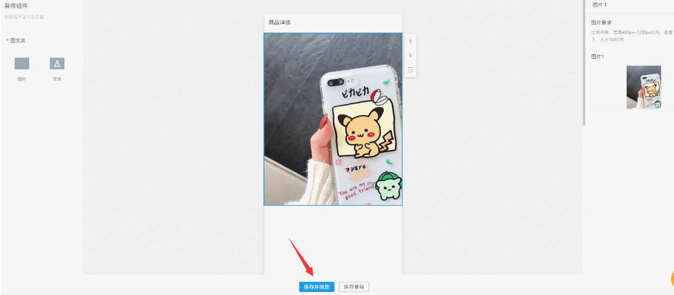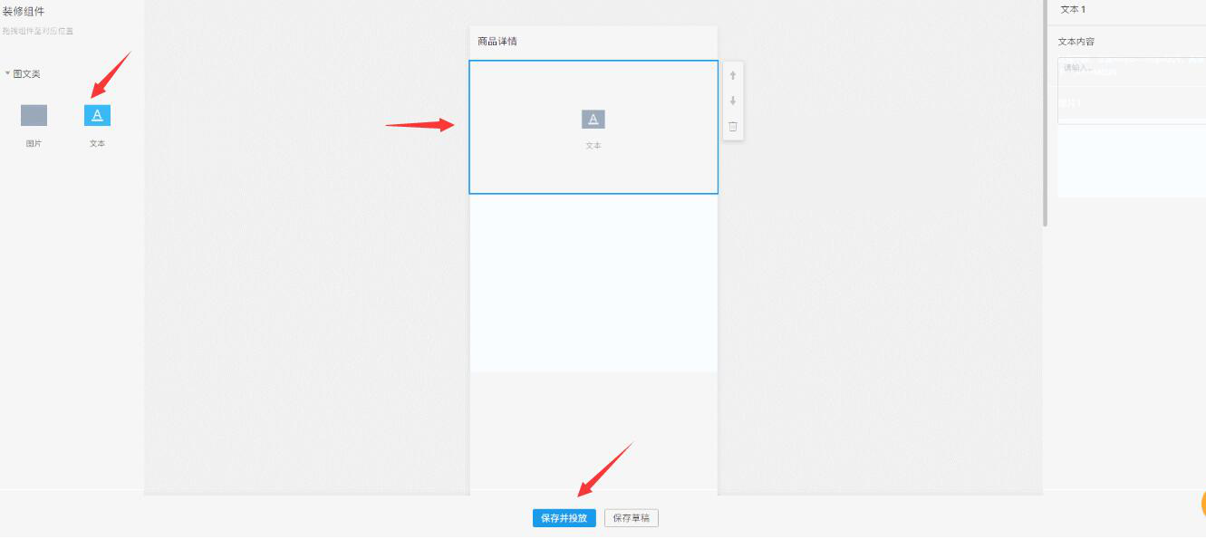 6、回到装修组件的操作界面,点击“文字”将文字内容拖放到商详的蓝色框中,再点击“保存并投放”的按钮。