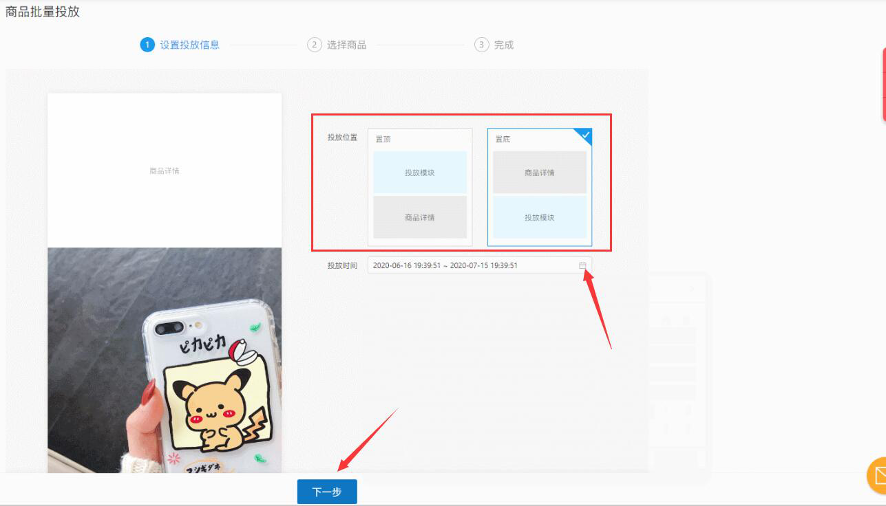 7、接下来,用户需要设置所投放的图片或者文字所出现的位置和投放时间。设置完成后点击“下一步”按钮。