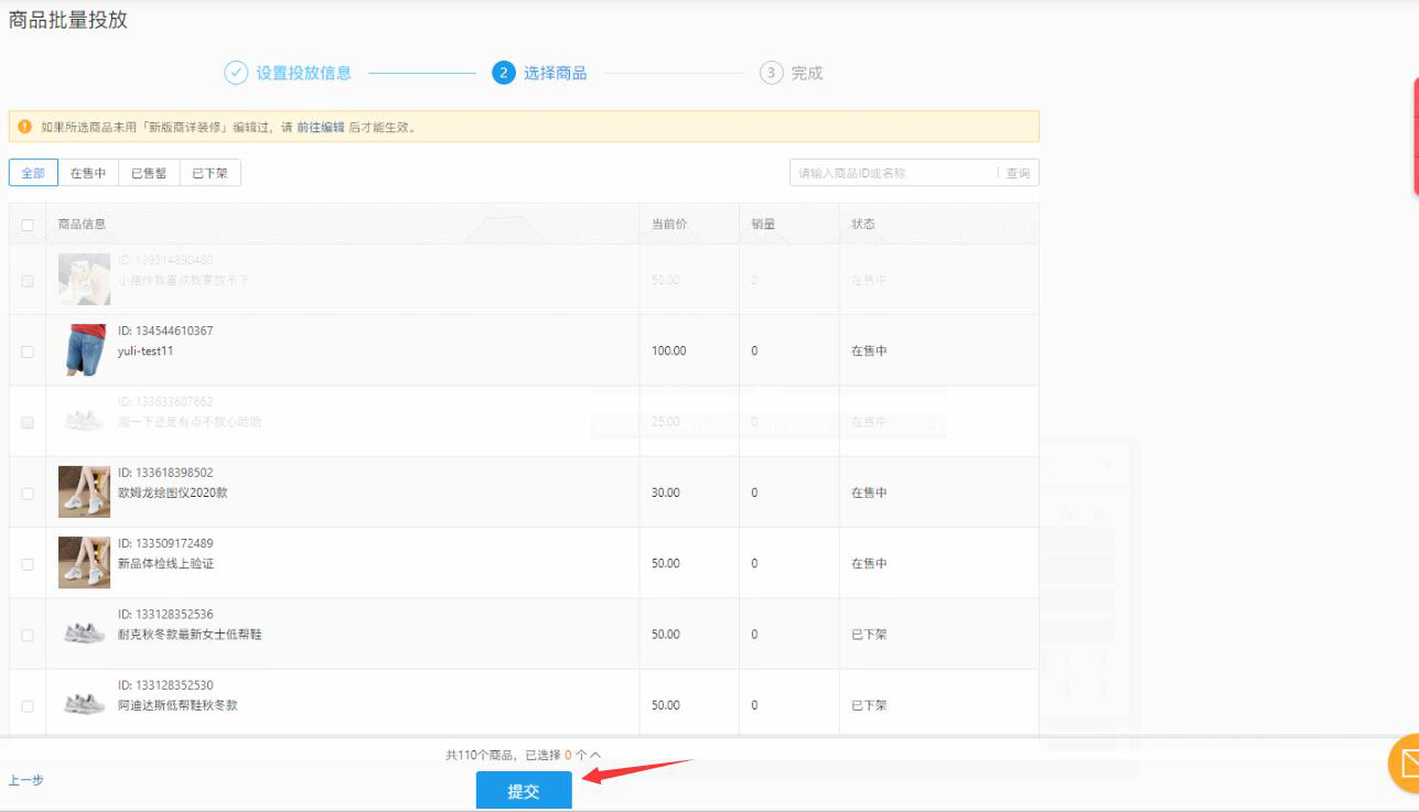 8、在商品列表中,勾选需要批量投放的拼多多商详,并点击“提交”按钮。