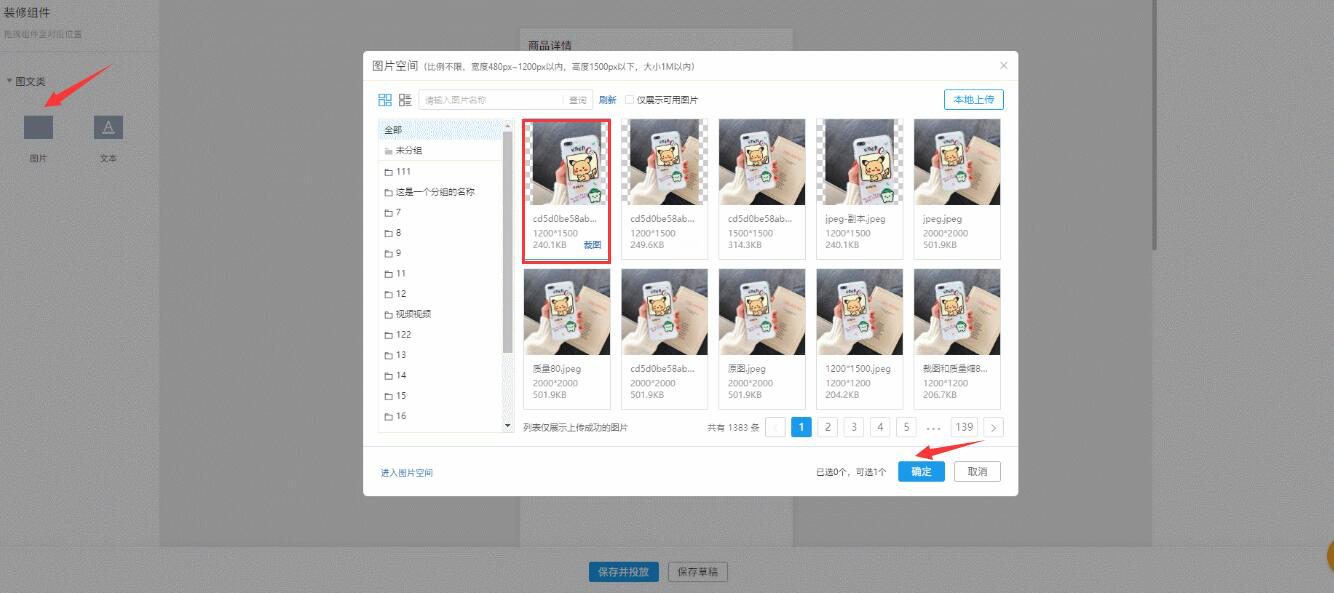 3、然后,用户根据自己商详所需要批量投放的内容来选择是投放图片还是文字。例如,要投放的是图片,就点击左侧装修组件中的“图片”,选定要投放的图片,点击“确定”按钮。