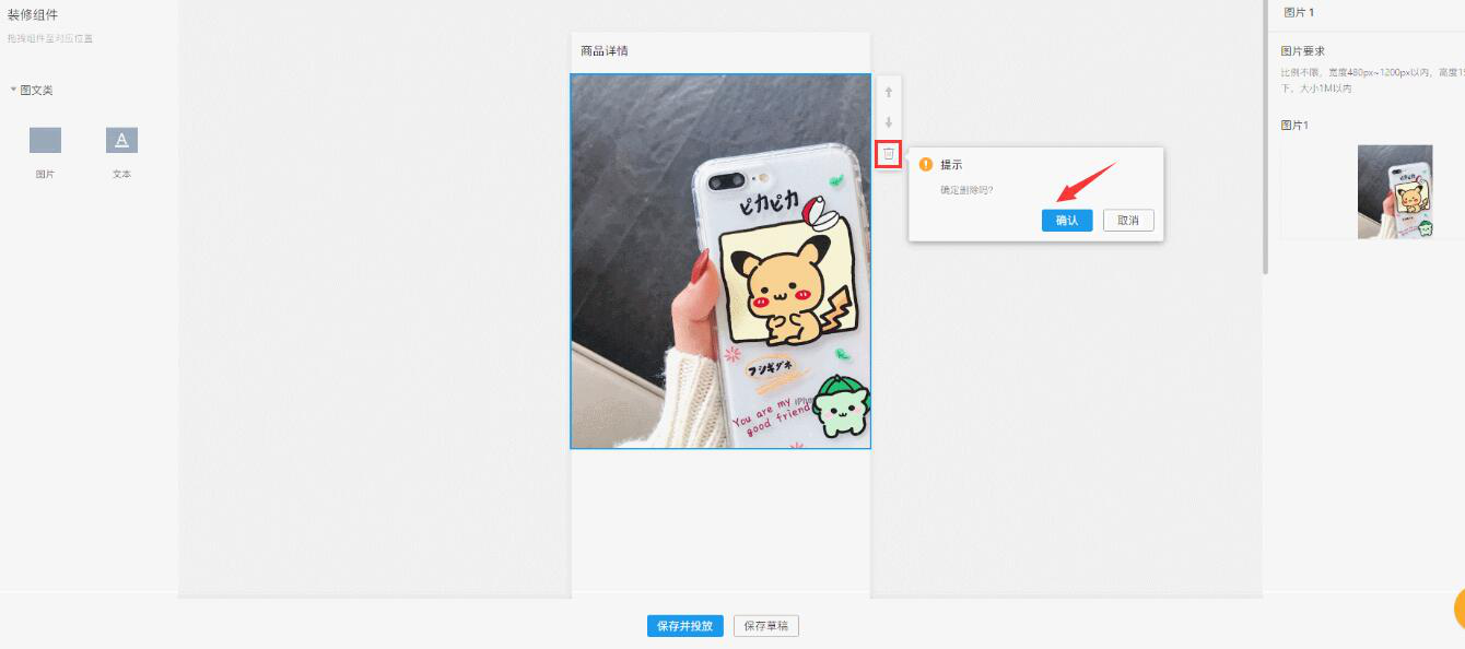5、如果拼多多商详需要批量投放的是文字,那么就点击该图右侧的删除按钮,弹出的提示小窗口中,点击“确定”。