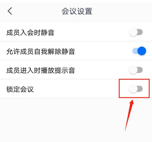 进入会议设置界面,点击打开【锁定会议】功能,按钮变成蓝色,即可阻止他人进入会议。