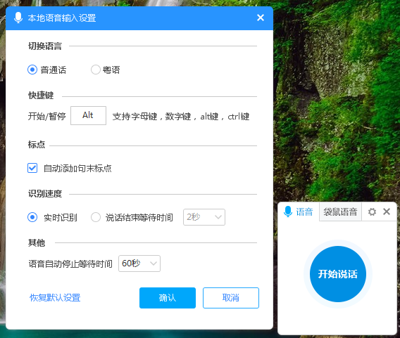 4、点击齿轮图标,打开“本地语音输入设置”窗口。在该窗口中,用户可根据自身语言习惯对语言、开始/暂停快捷键、是否自动加标点、识别速度及等待时间进行设置。