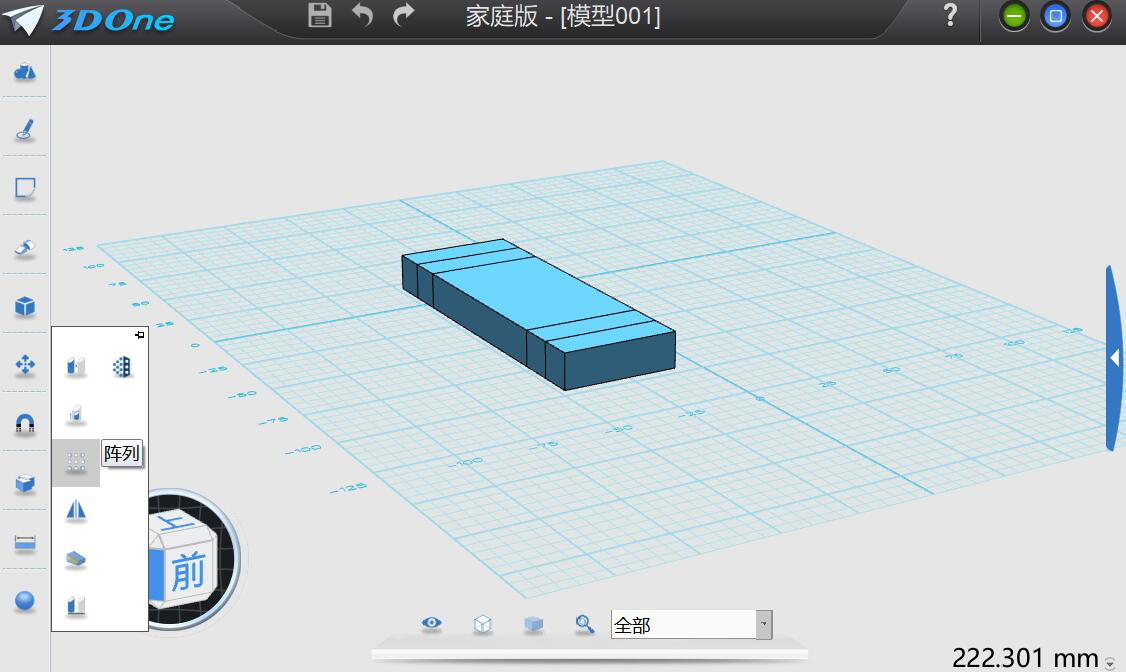 如果想要模型按照阵列的方式来排列,那么就可以调用3D One工具栏“基本编辑”中的“阵列”。可以采用线性或者圆形的方式来阵列,如下图就是采用线性阵列。它复制的数目和间距是可以自由调节的。