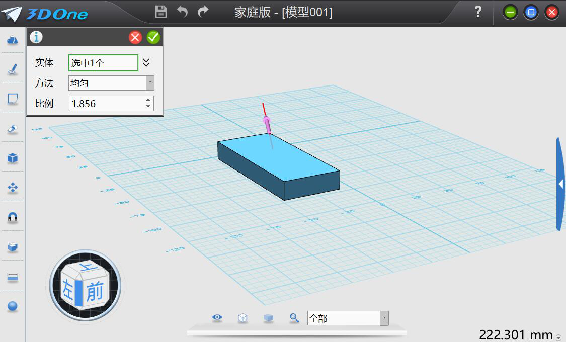 如果绘制的模型太大或者大小,可以通过3D One的缩放功能来调节。点击工具栏“基本编辑”中的“缩放”,鼠标直接点击模型即可实现缩放。