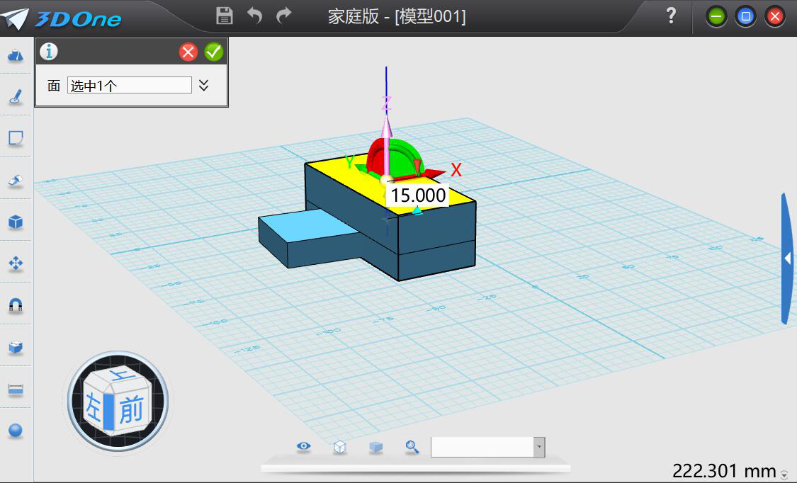 在使用3D One创建模型的时候,还常常会用到DE移动功能。通过平移模型的面来改变模型的形状。