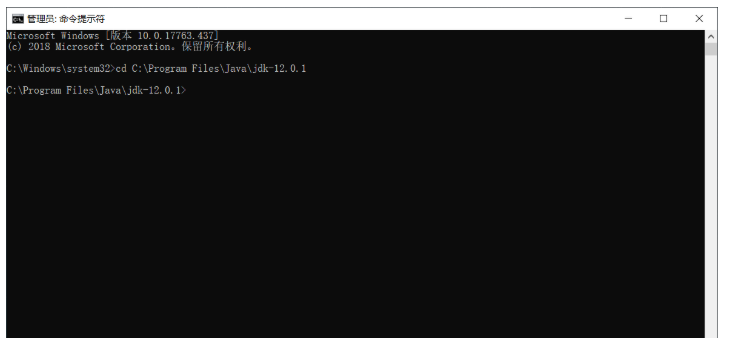 以管理员身份运行CMD,并输入cd C:\\Program Files\\Java\\jdk-12.0.1,注意,格式为【cd JDK安装路径】,要有空格,