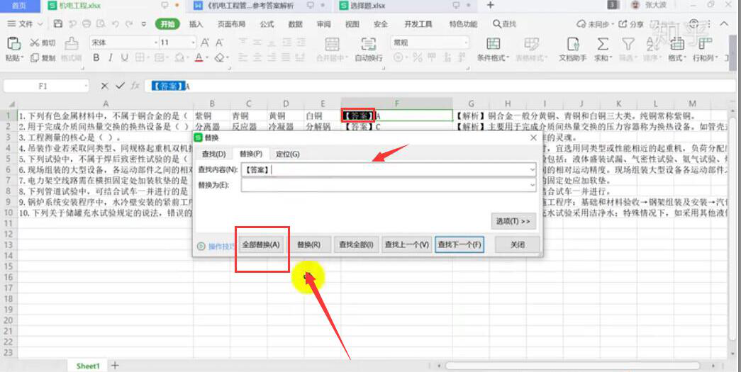 7、清除该Excel中的格式,将答案那一栏的文字和符号通过替换窗口删掉。