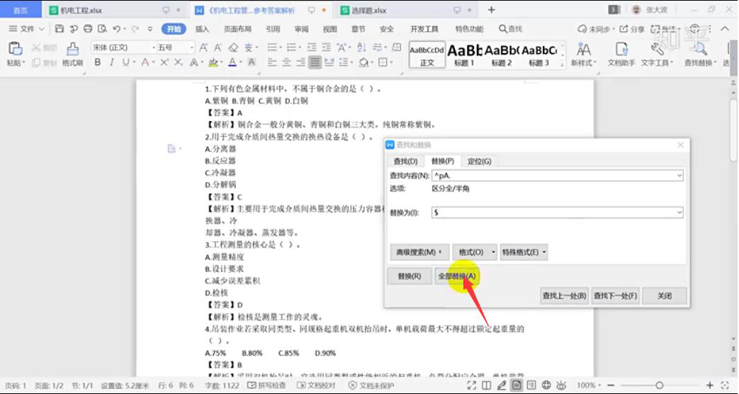 4、再“Ctrl+H”将Word的替换窗口打开。用户将那些换行的和选项字母的格式全部进行替换。替换完成,再将整个Word全选并复制。
