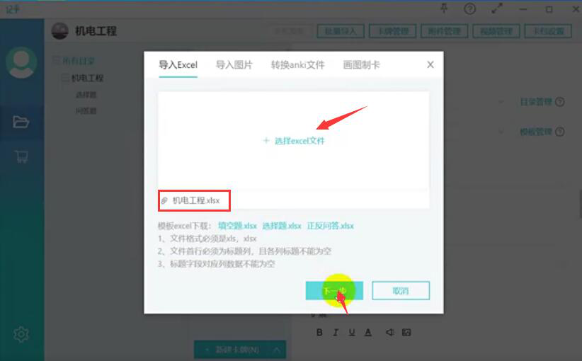 9、回到记乎的批量导入界面,点击“+选择Excel文件”,将刚才转换了Word的Excel表格导入,点击“下一步”按钮。