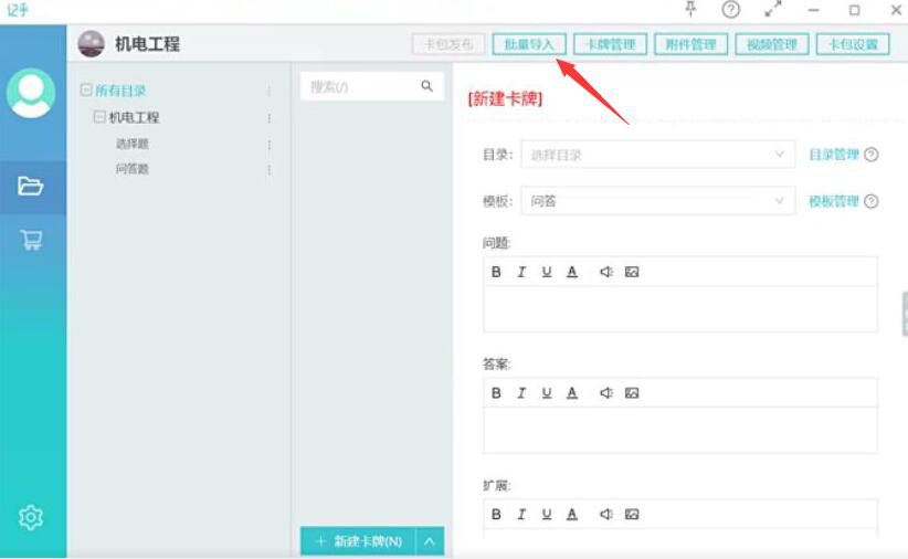 1、首先,用户打开记乎的卡片编辑器,将自己的卡包做好,点击“批量导入”的按钮。