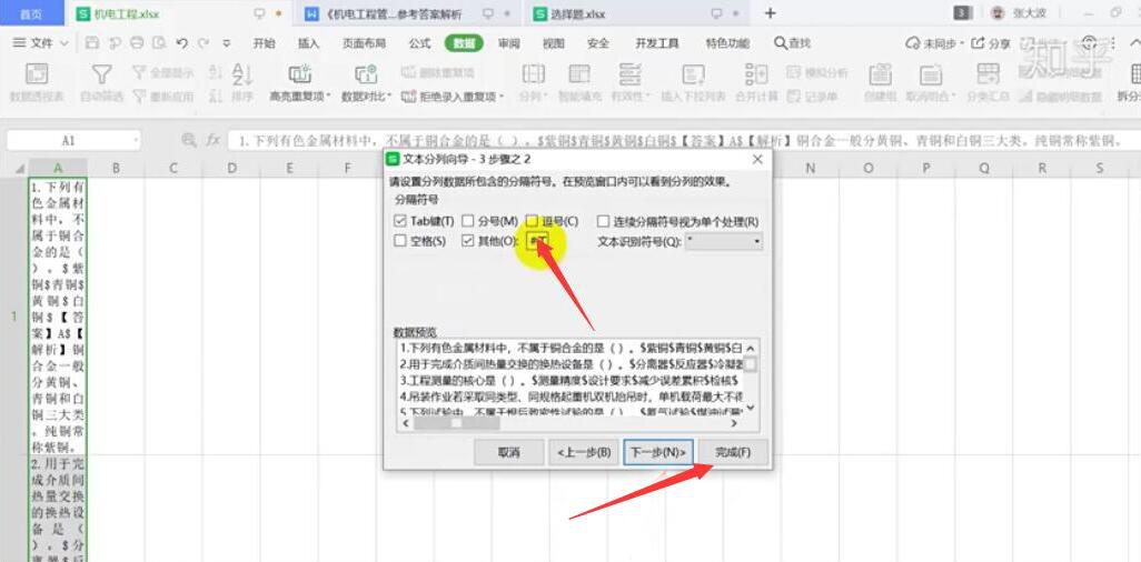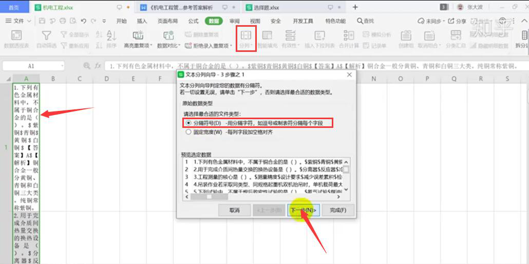 5、打开自己在记乎下载的Excel模板,在该Excel中的第一个单元格粘贴刚才复制的Word内容。点击“分列”,在它的窗口中,点选“分隔符号”,点击“下一步”的按钮。