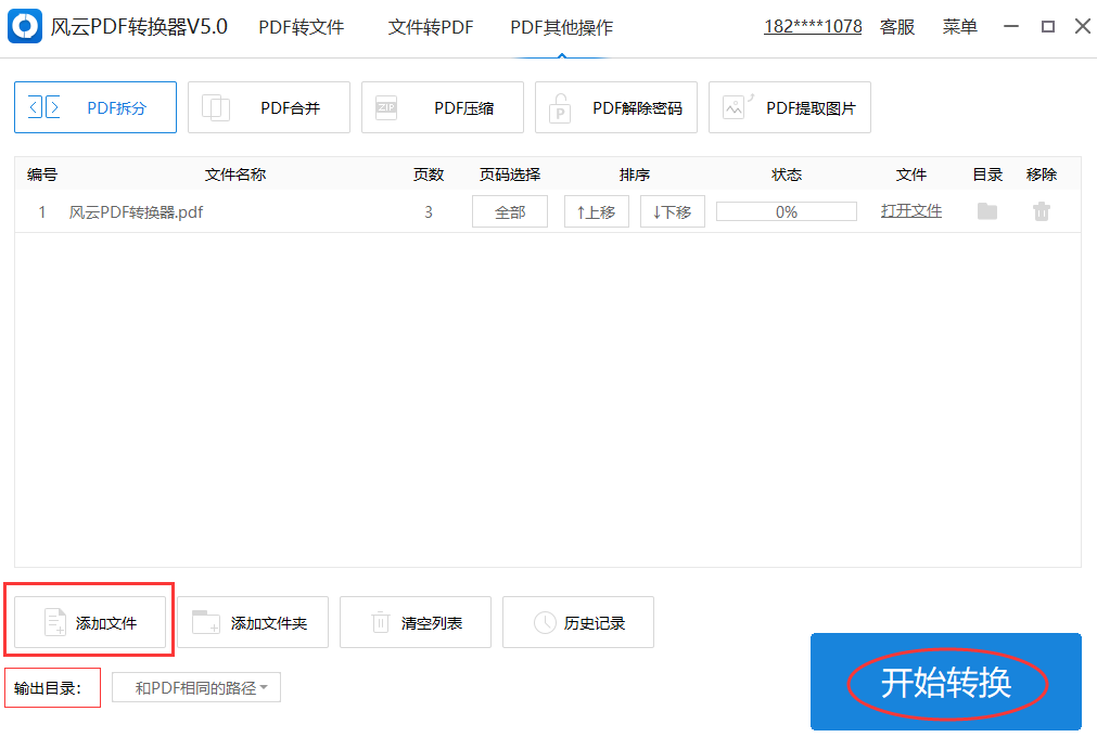 1、打开风云PDF转换器,点击最上方工具栏中的【PDF其他操作】,然后点击【PDF拆分】。