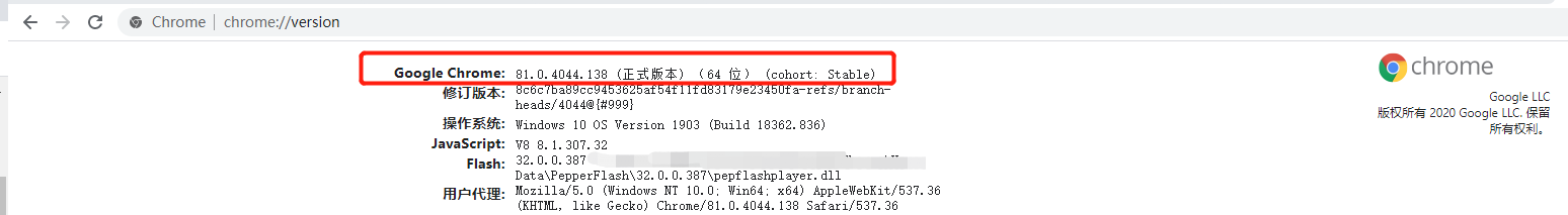 打开谷歌浏览器,在地址栏输入“chrome://version/”,然后回车即可查看当前浏览器版本。谷歌版本也需为64位版本,若不是则卸载重装。