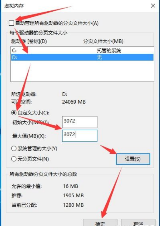 (5)在虚拟内存的设置窗口,按图中步骤将自定义值设为2048~4096,最后点击【确定】。