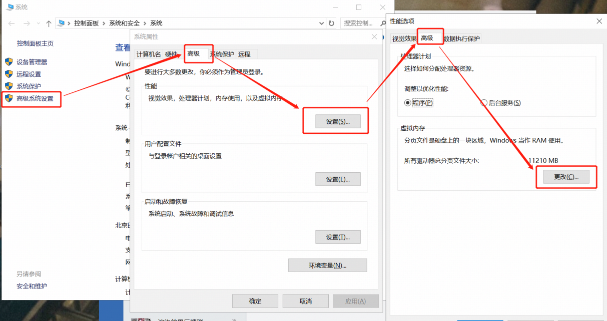 (4)在弹出的“系统”窗口中点击左侧列表中的【高级系统设置】,然后在弹出的“系统属性”窗口中依次点击【高级】—【设置】,最后进入“性能选项”窗口依次点击【高级】—【更改】,即进入虚拟内存的设置窗口。