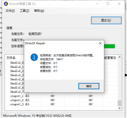 5)等待检测修复完成,点击【确定】。客户端dll缺失或损坏就被修复后需要重启电脑才能生效。