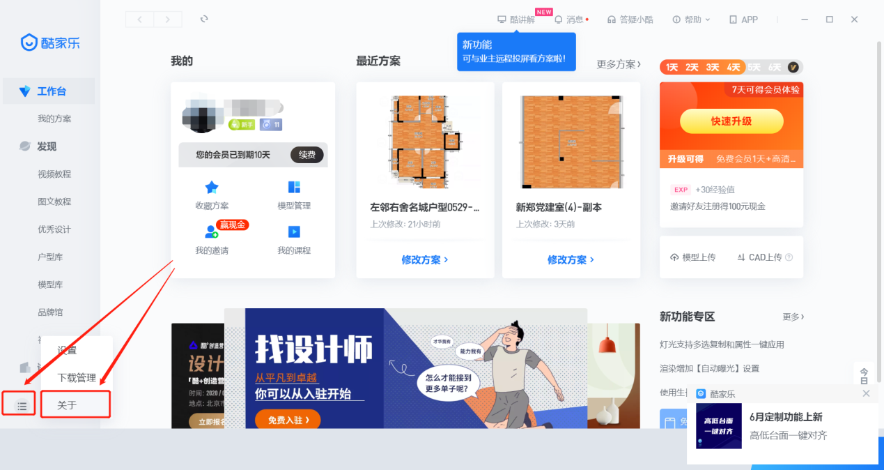 1、打开酷家乐客户端,点击左下角的“三”字图标(设置),在其上拉菜单中点击【关于】。