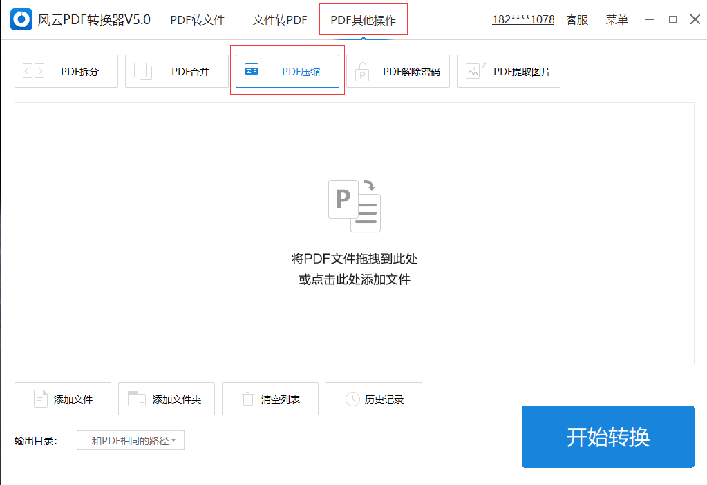 3、进入风云PDF转换器主界面,在最上方菜单栏点击【PDF其他操作】,然后点击【PDF压缩】。