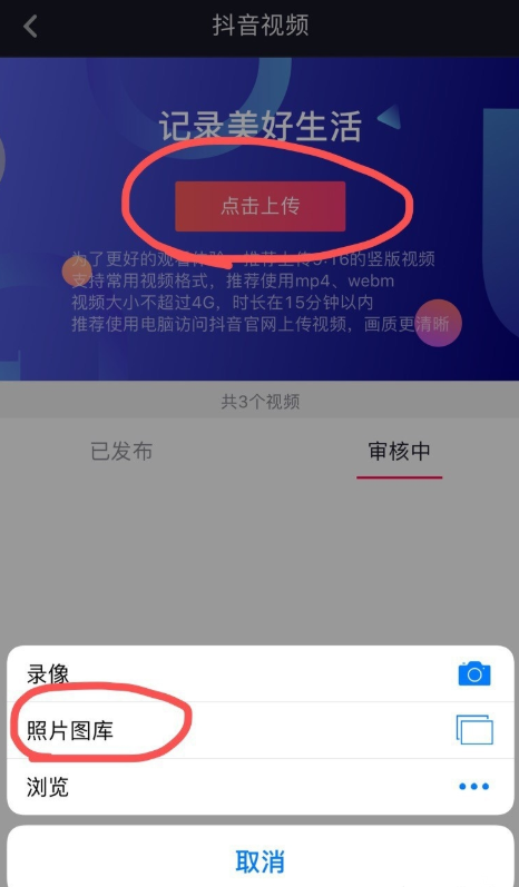 进入以下界面,点按【点击上传】,你可以直接录像,也可以从照片图库选择视频进行发布。