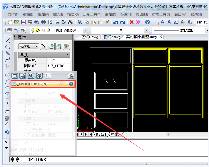 打开迅捷CAD编辑器,导入需要填充的图纸文件,在CAD命令行输入【OPTIONS】命令,按回车键,确认执行,