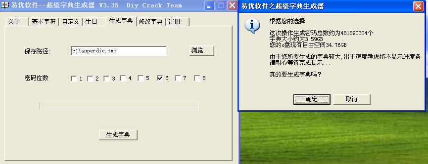 6、设置完成,点击【生成词典】选项,然后选择词典保存路径(一般改到非系统盘,由于是在虚拟机上做演示,这里就不改了),密码可能的位数,最后点击【生成字典】。弹出新窗口,注意一下生成词典预计的体积大小,然后点击【确定】。