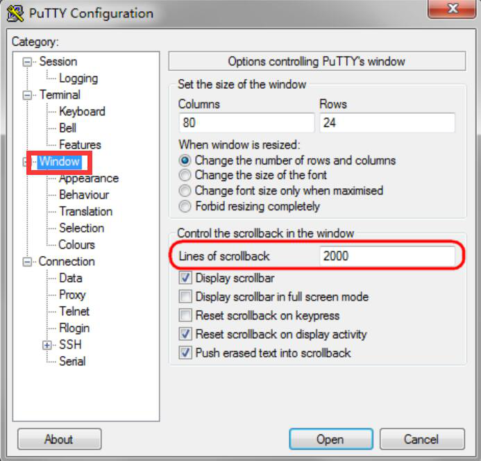 2、如果用户远程办公时需要PuTTY协助输出较多的文件内容,那么就可以在“Windows”菜单中,根据自己的需要重新设置“Lines of scrollback”的数值。