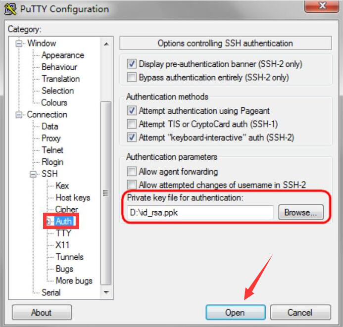6、此外,为了安全起见,用户还可以在PuTTY的“SSH”连接类型中点击“Auth”设置选项,点击“Browse”中的私钥文件,设置密钥后保存。再点击“Open”按钮开始连接登录。