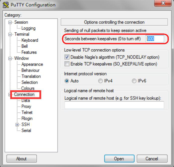 4、为了让PuTTY和远程服务器顺利传输,避免中途连接断开的情况发生,可以在PuTTY的“Connection”菜单中设置“Seconds between keepalives”的数值。