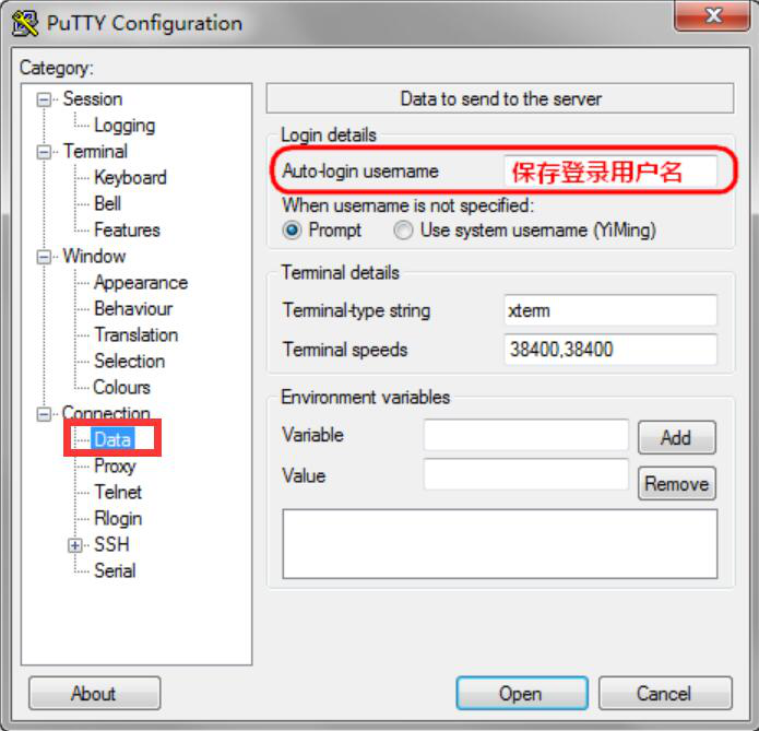 5、有些用户登录服务器的时候,比较习惯用同一个账号。那么就可以在PuTTY的“Connection”菜单中切换至“Data”的设置页面来设置默认的登录用户名。