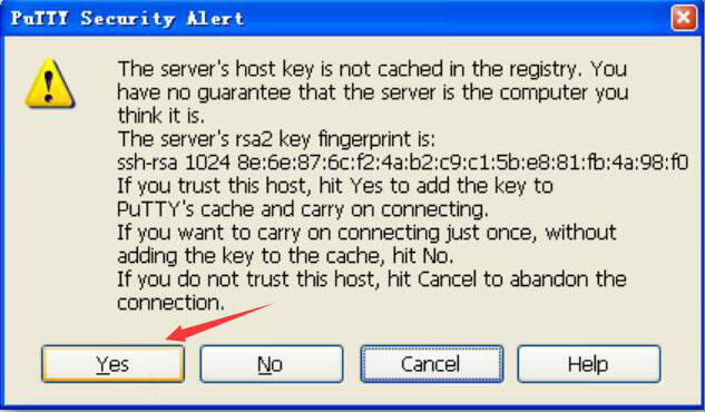 7、第一次连接的时候,PuTTY会弹出如下图的服务器指纹提示窗口,用户点击“Yes”按钮保存指纹。