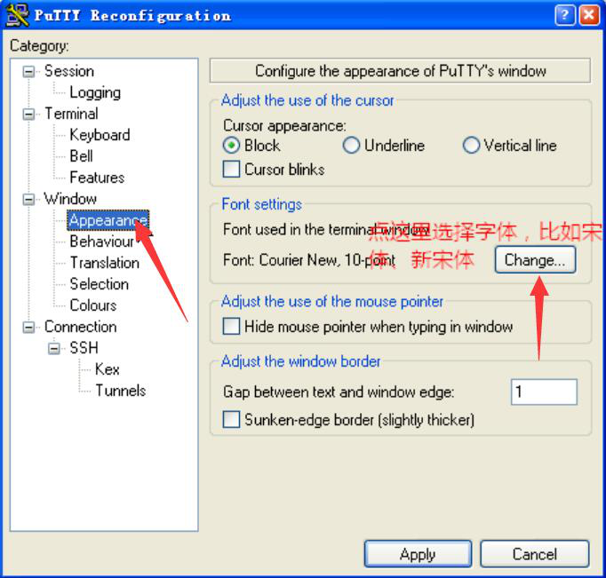 3、然后,用户若需要修改PuTTY操作界面的字体样式,可以点击界面中“Window”菜单里的“Appearance”,并在其右侧窗口中点击“Change”来选择字体的样式,例如宋体。