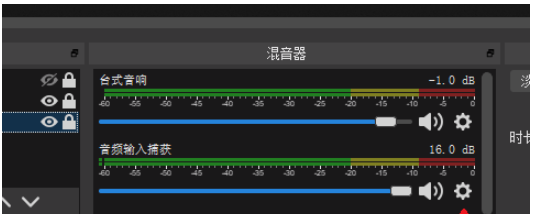 如图,OBS Studio软件已经启动,在电脑中播放音乐,查看【混音器】,桌面会有绿条波动,使用麦克风说话有绿条波动,
