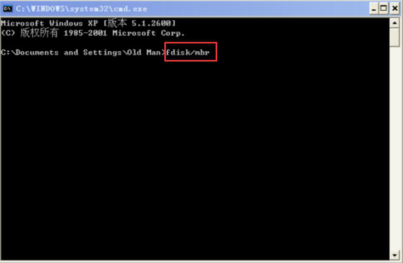 2、在cmd命令中,在如下图的适当位置输入“fdisk /mbr”命令,再按键盘上的回车键确定该操作。