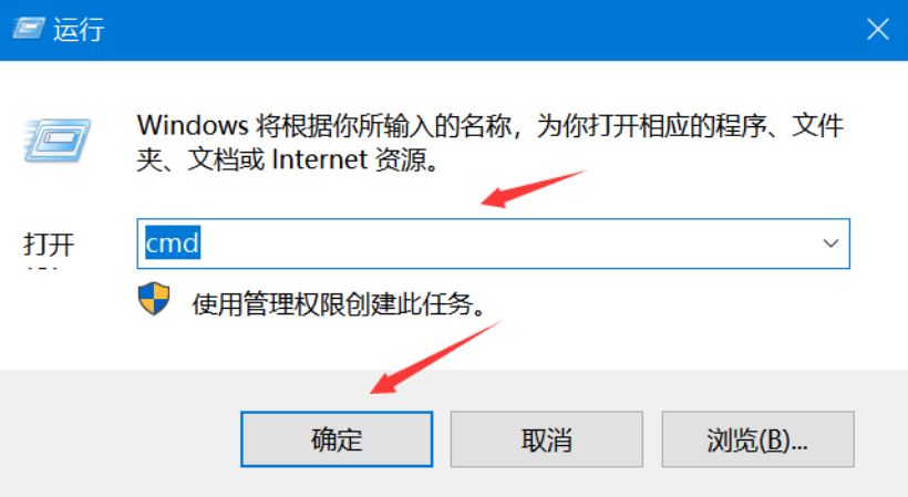 1、先将电脑重启,“win+R”打开运行框,输入“cmd”,点击“确定”按钮。