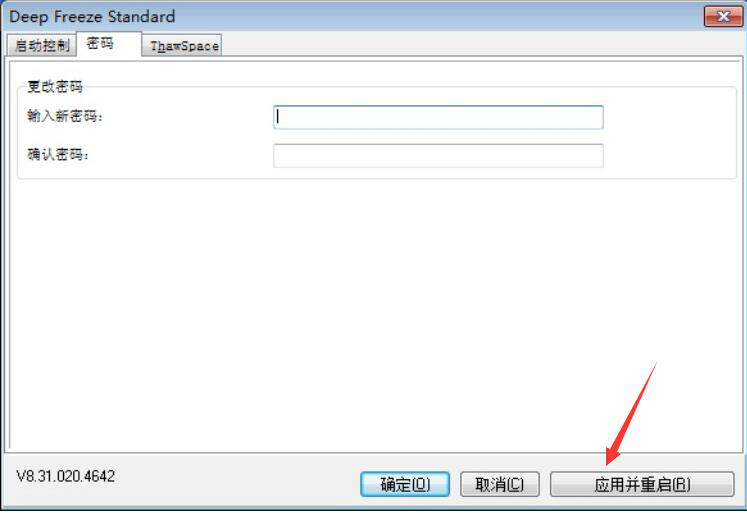 6、最后,在冰点还原精灵的密码设置页面中输入新密码并确认密码,点击“应用并重启”按钮即可生效。