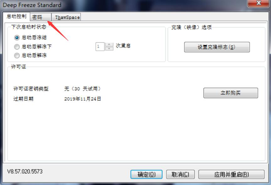 5、给新手们介绍完冰点还原精灵启动时的三种状态,接着我们来说说它的密码功能。用户在安装时有设置了登录密码,但如果设置的密码太长或者太简单,要更改的话,就可以点击“密码”。