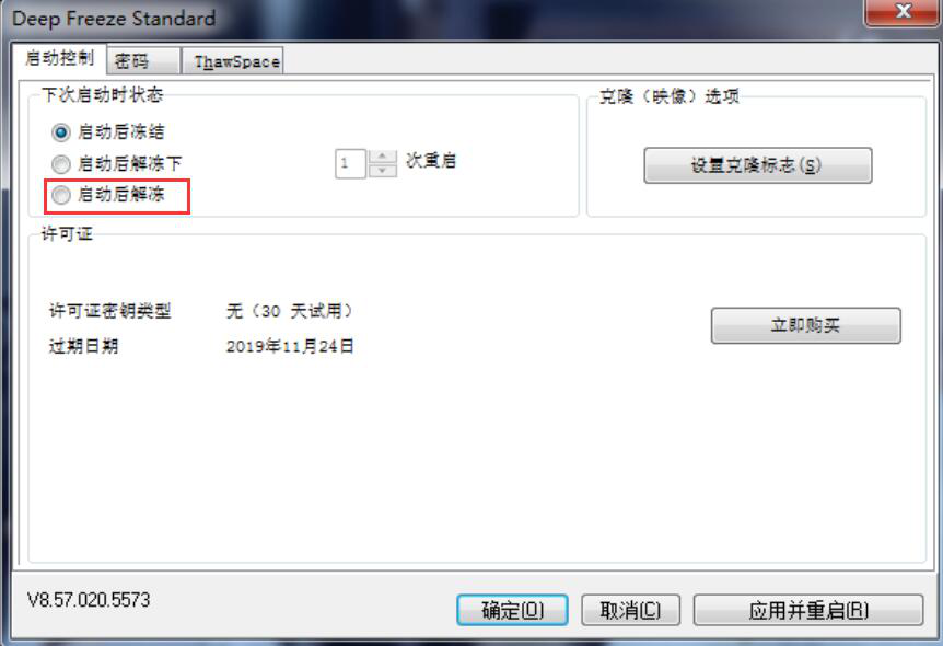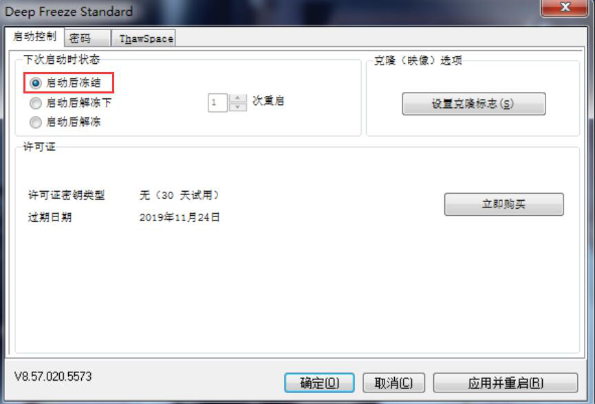 新手在使用冰点还原精灵的时候,要注意根据自己的实际需要来勾选下次启动时的状态。如果用户在使用过程中要安装其他软件,就先勾选“启动后解冻”状态,待软件安装完成后,再从另外两种状态中选其一对电脑实行保护。