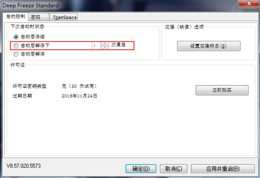 3、如果用户勾选的是“启动后解冻下”,根据自己的需要自由设置N次重启,那么电脑重启后便会有N次不被保护。