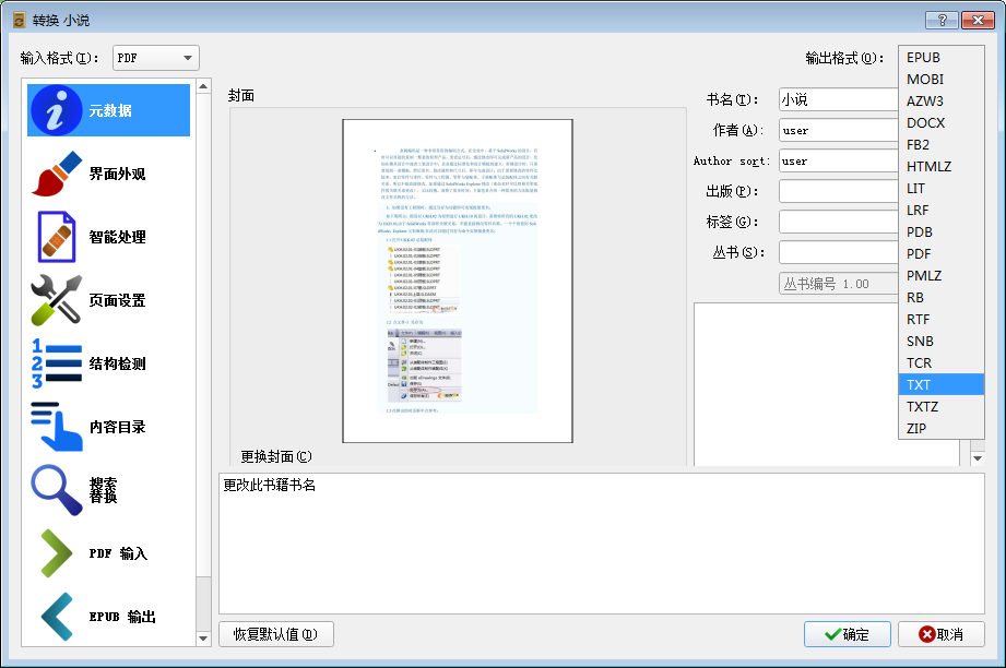 3、弹出“转换【小说】”窗口,该窗口默认出现左侧“元数据”中的内容,点击界面右上方输出格式后的小三角图标,选择要转换的格式。Calibre支持输出多种文件格式,这里我们选择最常用的TXT格式。