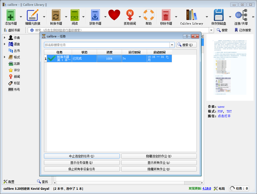以上就是关于如何使用电子书阅读器Calibre转换格式的介绍。当然了,Calibre不止可以把PDF格式转换成TXT格式,还能实现电子书在多种常用格式之间的相互转换,非常方便。