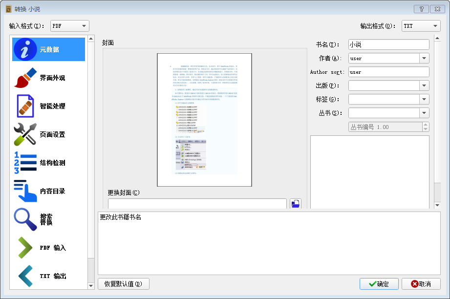 4、用户还可以在该界面修改输出文件的名称、作者、标签、封面等信息,设置好之后点击右下角【确定】自动退出窗口开始转换电子书。
