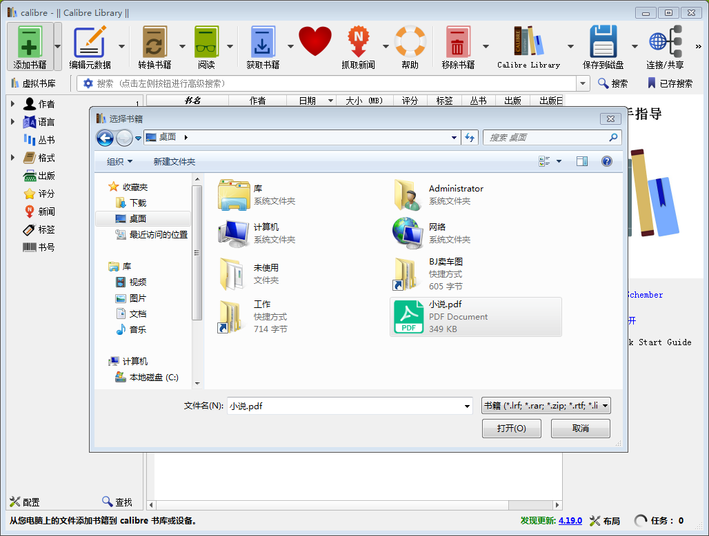 1、打开Calibre电子书阅读器,点击左上方【添加书籍】,弹出“选择书籍”窗口,浏览需要进行转换的PDF文件,这里选择一个名为【小说】的PDF文件,然后点击窗口右下【打开】。