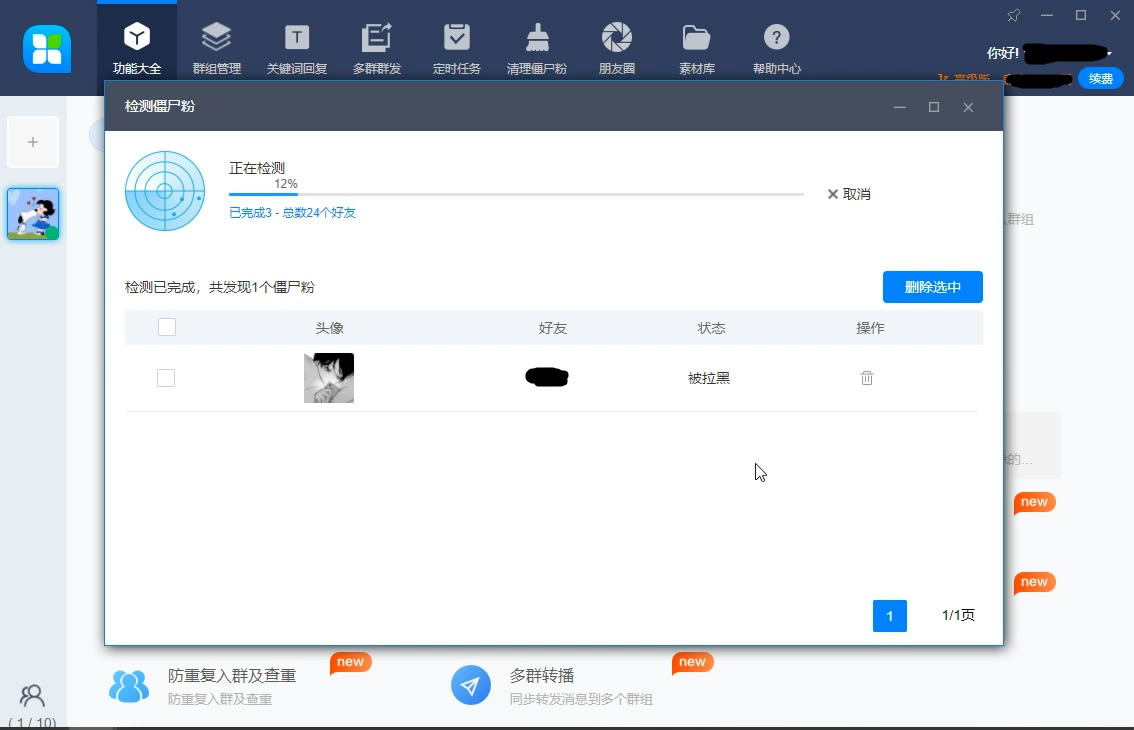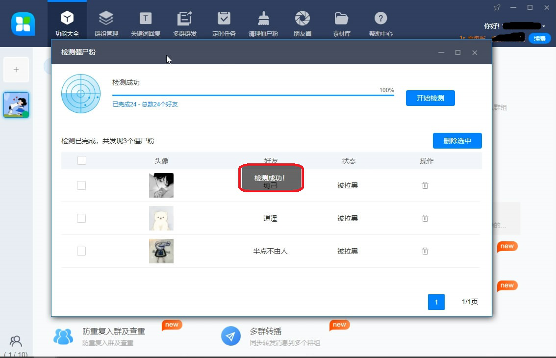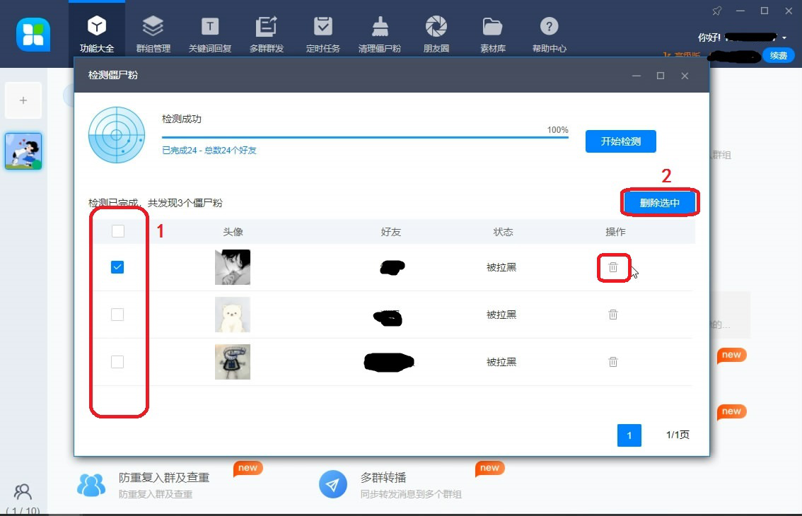 5、勾选检测出的僵尸粉,可以单选也可以多选,然后点击右侧的【删除选中】,或单独点击僵尸粉右侧对应的删除图标。