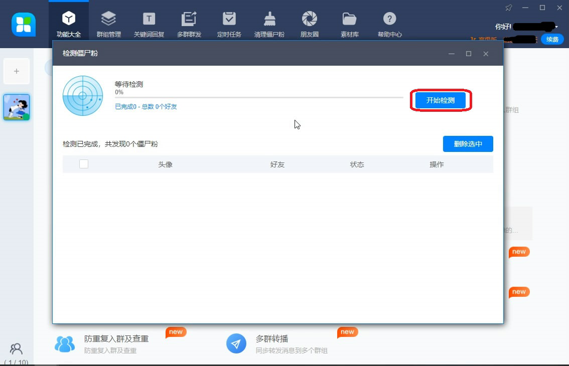 2、等待几十秒,就会弹出“检测僵尸粉”窗口,点击【开始检测】。