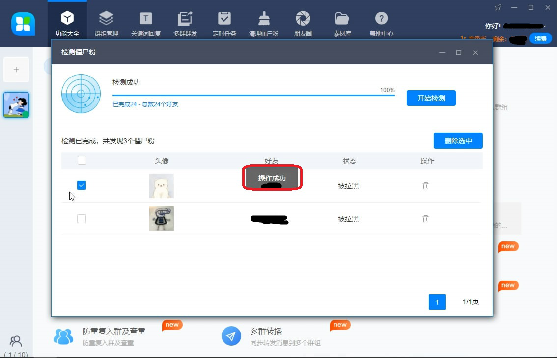 6、成功删除僵尸粉,系统会在界面中间弹出“操作成功”的提示。