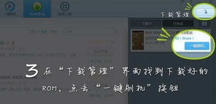 3、选择好对应的rom包后,等待rom包下载好,在下载管理界面中找到下载好的rom包,点击一键刷机按钮,如下图所示。