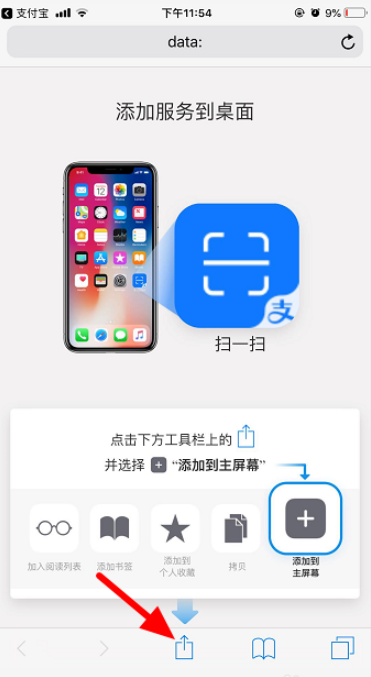 进入以下界面,如图,点击工具栏中的图标(箭头指示),选择【添加到主屏幕】,