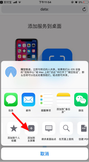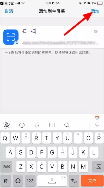 在屏幕下方左滑,找到并点击【添加到主屏幕】按钮,然后点击【添加】,即可将支付宝扫一扫功能添加到手机桌面。