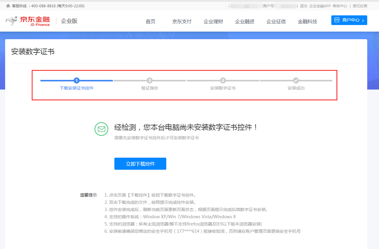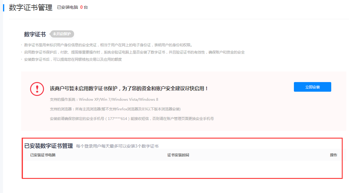 2)启用数字证书之前需要商户先绑定安全手机号和邮箱。